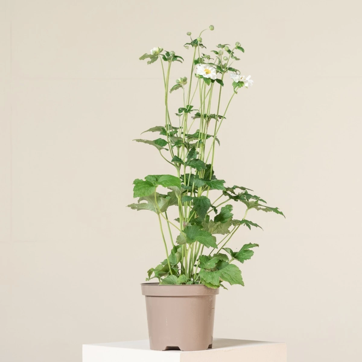 Anemone x hybrida ‘Honorine Jobert’ is a slowly spreading, rhizomatous perennial with largely evergreen, lobed leaves and producing tall sprays of white, yellow-centred, daisy flowers from late summer through autumn