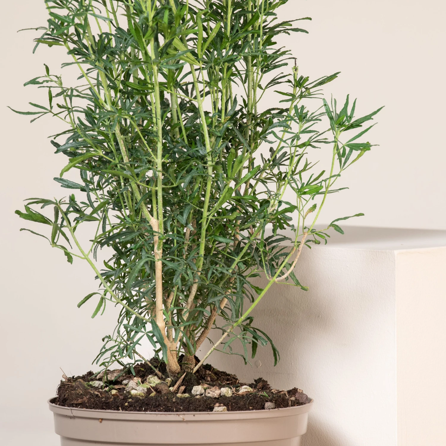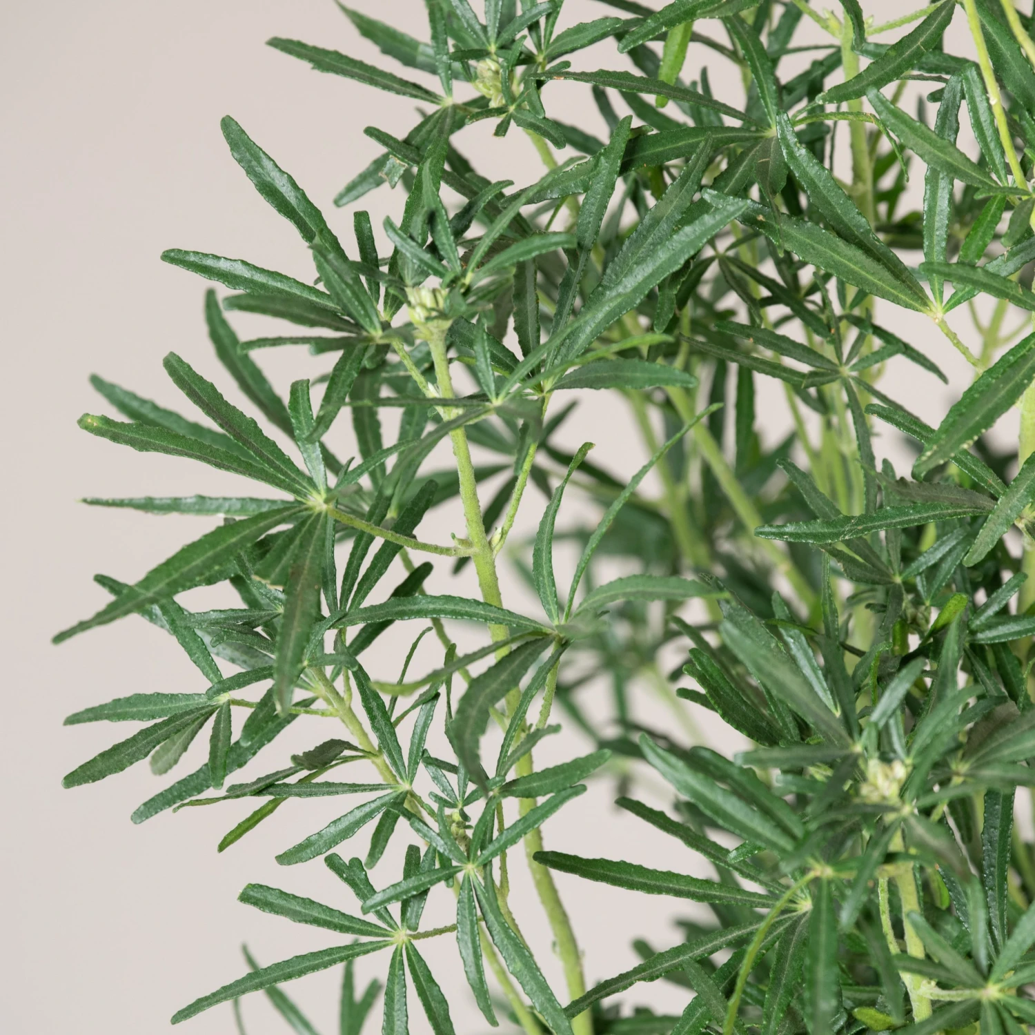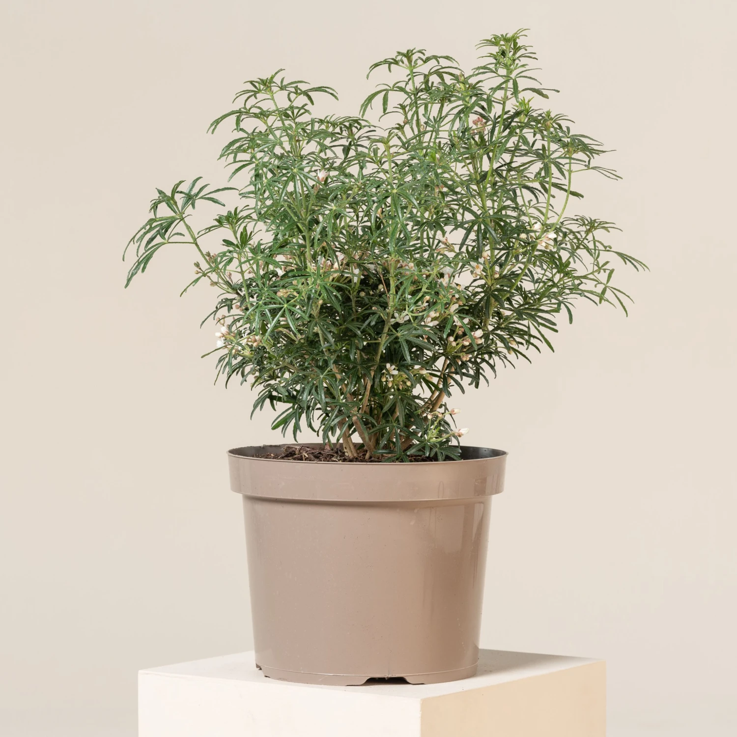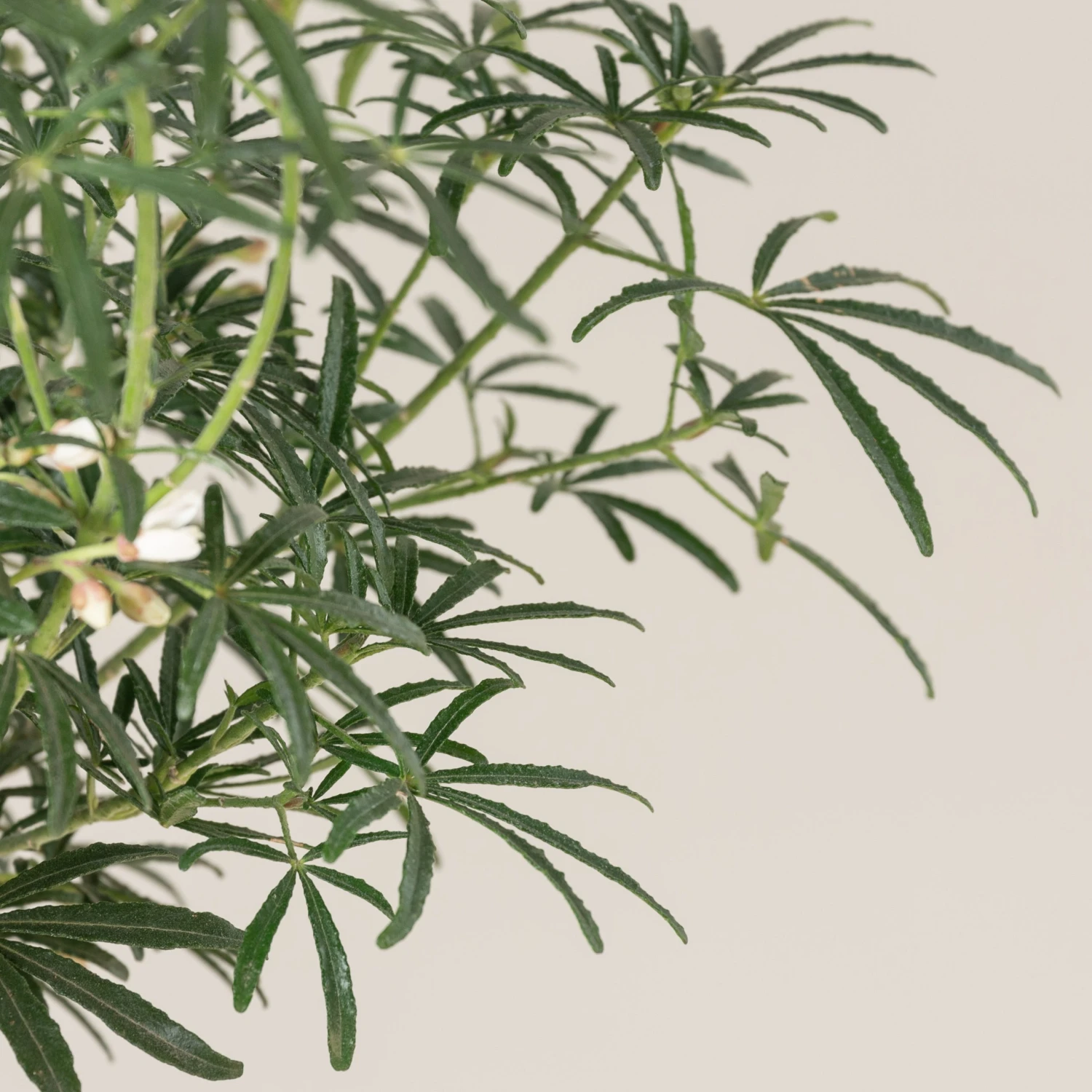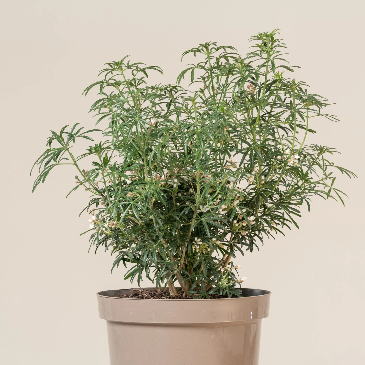A lovely compact evergreen shrub, with finely cut fingers of glossy green foliage.