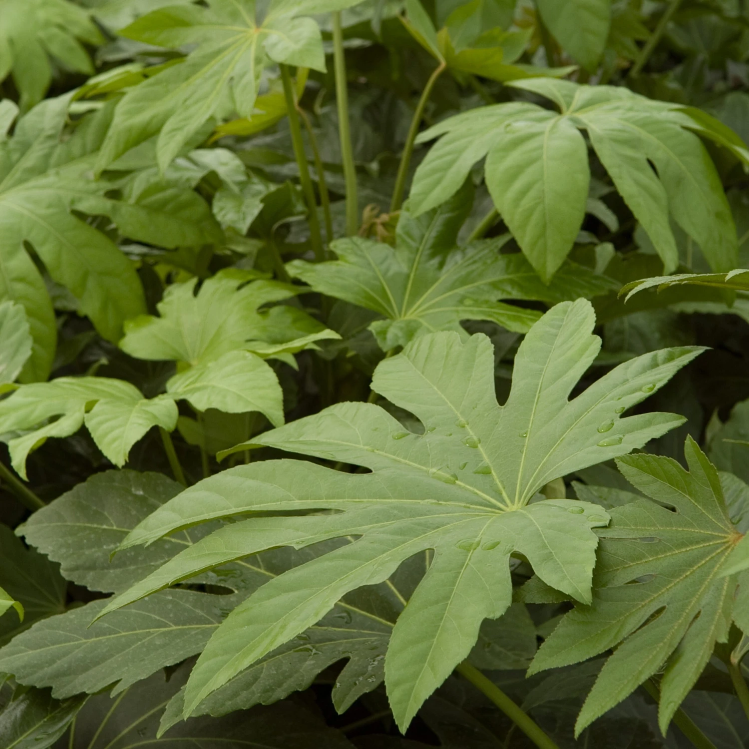 Fatsia japonica features iconic lobed leaves, and produces pleasing white flowers and black berries in autumn.