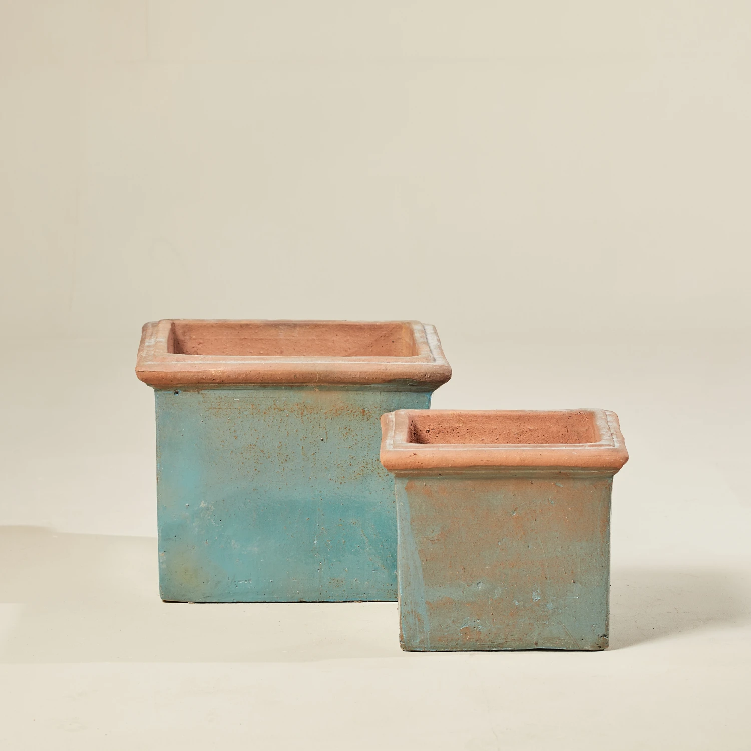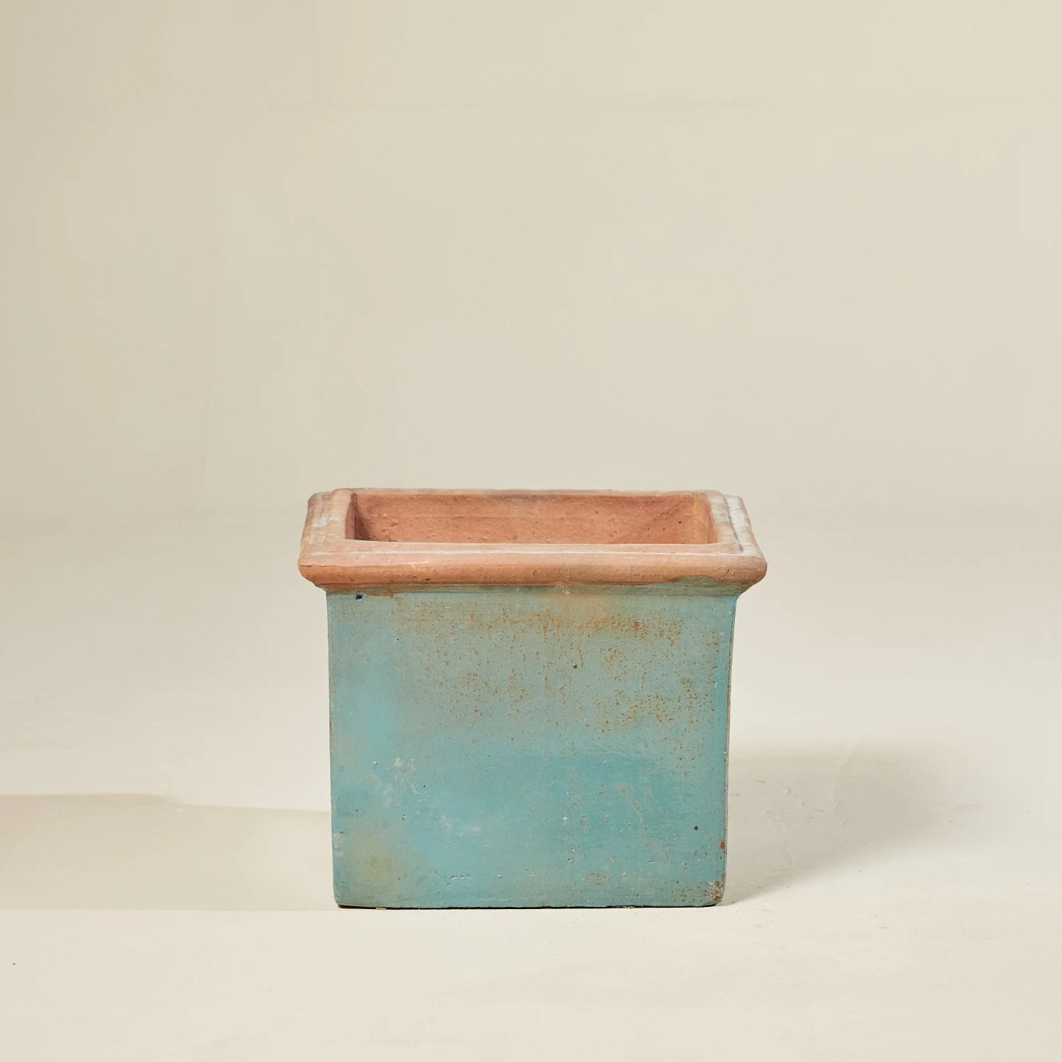 Genia Square pot is a beautifully crafted square planter, featuring a unique weathered turquoise finish that adds a touch of vintage elegance to any dΓ©cor.