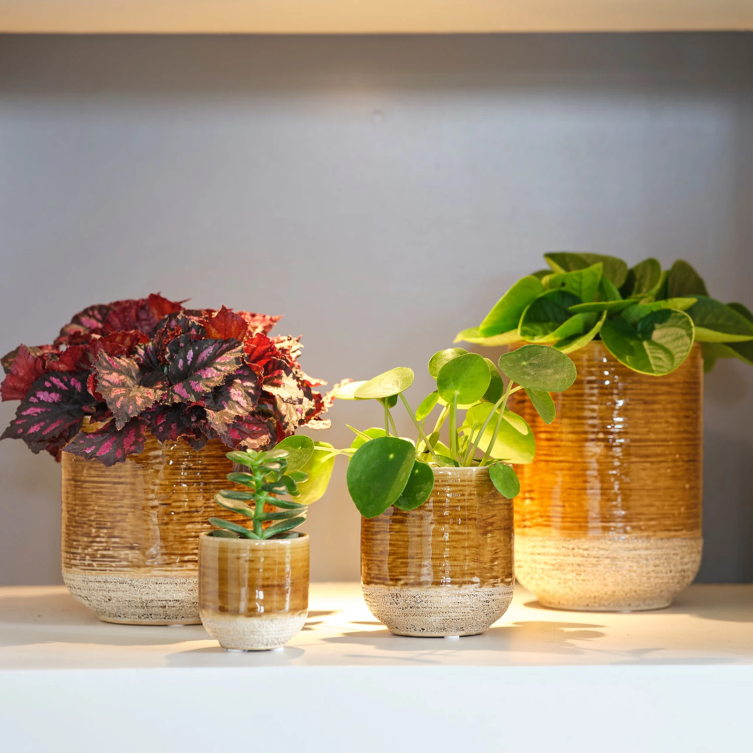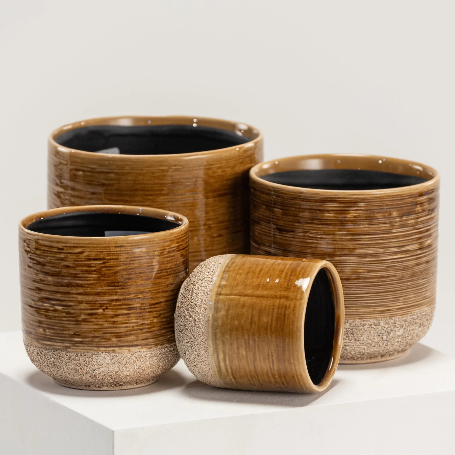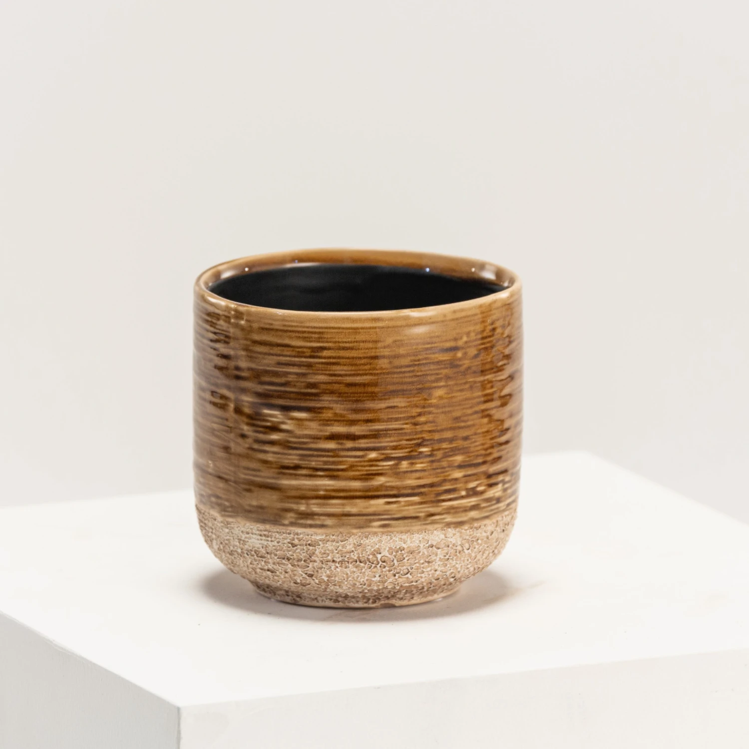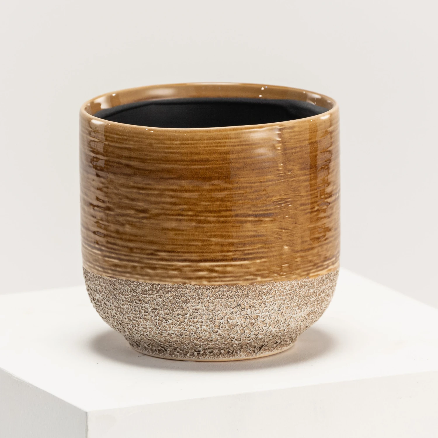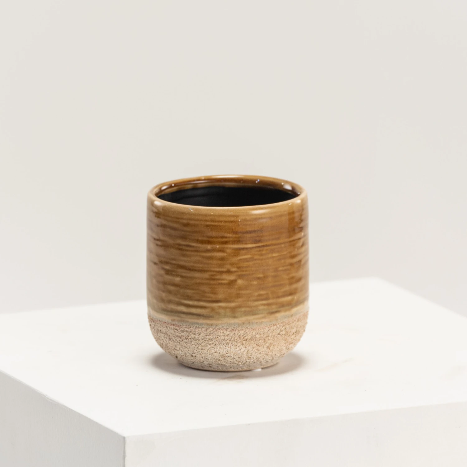 Issa is a family of two-textured pots, featuring coral-esque bottom halves and smooth glazed ceramic uppers, styled in horizontal rings. This Issa colouration is a deep yellow and brown.